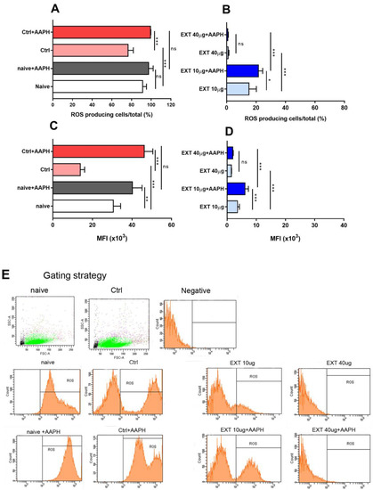 Mitochondria are considered the primary site of ROS production from aerobic respiration under physiological and many pathophysiological conditions. Splenocytes diluted at a concentration of 1 × 106 cells/mL were treated in 24-well plates for 24 h in triplicate with 10 or 40 μg/mL of EXT. Untreated cells served as the control, and naïve cells were used as intact control. Production of intracellular ROS was determined using the fluorescent dye H2DCFDA, which is oxidized to the fluorescent form in the presence of ROS. Dye (5 µL/mL, 1 mM solution) was added for 4 h before the end of the assay, and generation of ROS in cells was induced by AAPH (1 mM final concentration) added one hour before end of the assay. Nonadherent splenocytes were transferred to tubes, and adherent cells were detached with 300 μL of warm Accutase for 20 min at 37 °C, collected into tubes, and washed. Then, both cell fractions/well were pooled, resuspended in 200 µL of CM, and the proportions of ROS-producing cells and MFI reflecting ROS concentration, were measured by flow cytometry using a FACS Canto flow cytometer. The assay was repeated twice.