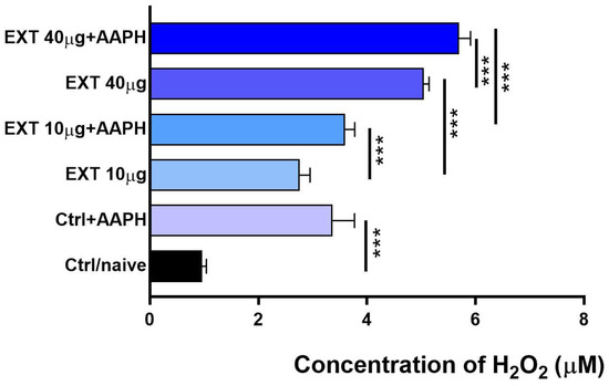 2 concentration was significantly higher at 40 μg/mL than at 10 μg/mL and was proportionally increased in cultures treated with AAPH together with EXT. Since AXT and its esters, unlike other carotenoids, do not exhibit prooxidant activity, we assume that AXT esters present in EXT stimulate, proportionally to their concentration, the conversion of ROS to H