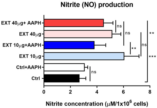 70]. We nondirectly determined the spontaneous extracellular production of NO as nitrite by spleen cells within 24 h of cultivation under hyperoxia-like conditions and the effects of EXT at concentrations of 10 and 40 µg/mL. Compared with the control, the NO concentration was significantly increased in the presence of EXT and more so at lower concentrations, whereas AAPH did not further increase NO. Sun et al. [