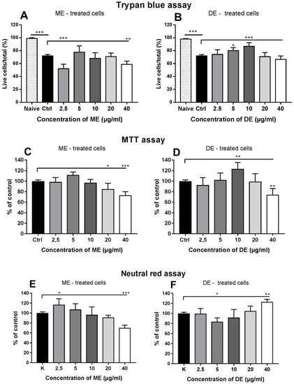 6 cells/mL in CM) were placed in 24-well plates in triplicate for each treatment and control with EXT, ME, and DE at concentrations of 2.5, 5, 10, 20, and 40 μg/mL for 24 h. One hour before the end of the assay, 20 µg/10 µL of neutral red (in CM) was added to each well. Extraction of the internalized dye was performed separately for nonadherent and adherent cells using 200 µL of the extraction buffer (1% glacial acetic acid, 50% ethanol in distilled water). The optical density of the extracts from both cell counterparts/well was measured in a 96-well plate at 550 nm using a Multiscan FC Plate Reader. Subsequently, the OD values for adherent and nonadherent cells/samples were summed and used to calculate the mean ± SD from three replicate in vitro experiments.