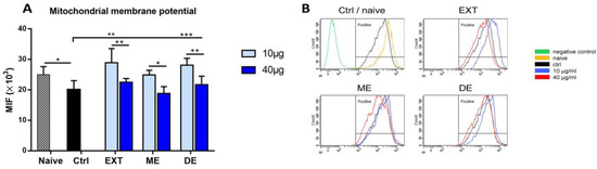 Mitochondria are key organelles for cell survival, and loss of mitochondrial membrane potential (Δψm) is considered a hallmark of programmed cell death (apoptosis). Splenocytes diluted at a concentration of 1 × 106 cells/mL in CM were treated with 10 or 40 μg/mL EXT, ME, or DE for 24 h in 24-well plates; untreated cells were used as control. Mitochondrial potential was also evaluated in the naïve cells before incubation. To monitor the membrane potential of mitochondria, we evaluated changes in rhodamine 123 oxidation by its epifluorescence intensity. This dye is absorbed by mitochondria of living cells. Changes in dye uptake reflect Δψm and are expressed as mean fluorescence intensity (MFI). Nonadherent splenocytes were transferred to tubes, and adherent cells were detached with 300 μL of warm Accutase solution at 37 °C for 20 min, collected in tubes, and washed with CM. Then, both cell fractions/well were pooled, and rhodamine 123 solution was added at the final concentration of 10 μM. Splenocytes were incubated at 37 °C for 20 min, the supernatant was removed, and cells were resuspended in 200μL of PBS. Finally, mitochondrial membrane potential was measured in the cell suspensions after excitation of rhodamine 123 at 505 nm and emission at 535 nm. The assay was repeated three times.