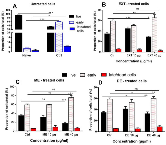 Quantification of cells undergoing apoptosis is important to assess the effects of drugs and other substances. Splenocytes diluted at a concentration of 1 × 106 cells/mL in CM were treated in 24-well plates for 24 h with 10 or 40 μg/mL of EXT, ME, or DE in triplicate; untreated cells were used as control. Naïve cells were used as intact control. Nonadherent splenocytes were transferred to tubes, and adherent cells were detached with 300 μL of warm Accutase for 20 min at 37 °C, collected into tubes, and washed. Then both cell fractions/wells were pooled, washed in cold PBS, and stained (in binding buffer) with Annexin V and propidium iodide solutions at room temperature using the BD Pharmingen Annexin V-FITC Apoptosis Detection Kit (BD Biosciences, CA, USA) according to the manufacturer’s instructions. Analysis was performed by flow cytometry using a FACS Canto flow cytometer. The proportions (%) of live cells and cells in different stages of apoptosis were evaluated using FACS Diva software. The assay was performed twice.