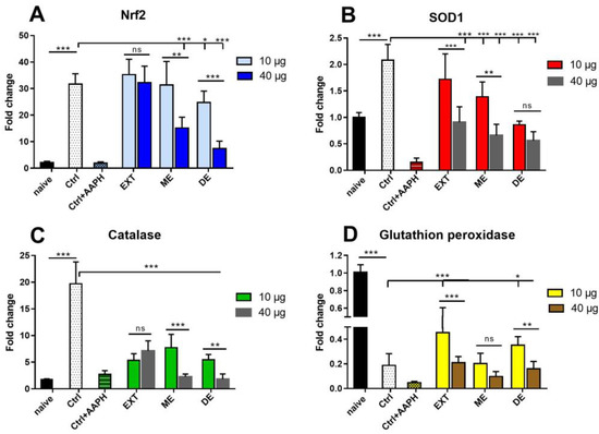 58]. Surprisingly, adding AAPH almost completely abolished gene transcription, although maximal stimulation was expected at least for Nrf2. This might be related to the detrimental effect of the AAPH molecule on this biological process. Therefore, we did not further use this chemical stress inductor in treated splenocyte cultures. While at both concentrations of EXT (10 and 40 µg/mL), Nrf2 gene transcription remained upregulated, incubation with ME and intense DE resulted in a significant decrease, and, as previous results showed, the high concentration was more suppressive. A very similar trend in mRNA transcription was observed for SOD1 and catalase, which was more highly expressed than SOD1 and GPx1, suggesting that catalase had the main role in H