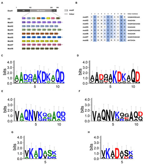 The sequences of each motif and linker are shown in Figure 1B. The more conserved the amino acid site, the darker its background color. Each motif almost conforms to the rule of 11-mer motifs and the amino acids at positions 2, 6 and 10 are the most conserved. The “KDK” conserved sequence exists in most HD motifs, but it does not seem to follow this rule completely in Motif1 and Motif8. In Motif1, “A” in position 8 replaces the second “K” and “N” in position 11 replaces “D”, and in Motif8, “Q” and “S” in position 7 and 8 replace “D” and “K”, respectively. There are some differences in position 1; “L” in Motif2 and “V” in Motif1 and Motif8, but they belong to hydrophobic amino acids. Regarding the linkers, there are 11 residues in Motif1/3/5/7 and some differences in amino acids at several sites. “V” in position 1, “A” in position 9 and “QNV” in positions 3, 4 and 5 are absolutely conserved in four linkers. There is “R” in position 7, “E” in position 8 and “A” in position 10 of linker 1, “S” in position 8 of linker 7, which is maybe the greatest difference from others. There were seven residues in Motif2/4/6/8, including “T” and “A” in Motif8, which differs from the corresponding sites in other linker sequences. Some other sites may not be completely conserved, but are consistent in being charged or hydrophobic. In Figure 1C,D, we compared the eight motifs with hydrophobicity and charge properties using WebLogo3, respectively. The results showed that, as mentioned above, the “KDK” sequence was relatively conserved. Furthermore, the amino acids characteristics at each site are fully exhibited in these two figures. We also performed amino acid alignments regarding linkers containing 11 (Figure 1E,F) and 7 (Figure 1G,H) amino acids with hydrophobicity and charge properties, respectively.