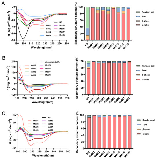 Interestingly, the UV absorption of HD protein had a negative peak at 198 nm and a small, wide peak around 220 nm, which was different from those of artificial proteins (Motif1–8) forming their maximum peak at approximately 192 nm and minimum peaks at 208 and 222 nm, indicating that these artificial proteins were ordered under phosphate buffer (Figure 2A). The stacked bar graphs in the right half of Figure 2 showed that the α-helix content of proteins became greater than previously with the addition of 50% TFE (as a well-known α-helix inducer in general) or 50% glycerol (generally used to mimic waterloss conditions) (Supplementary Table S2) [20,21,22,23,24], implying that, the HD protein had undergone steric modification with the process of changing from a disordered to ordered structure. Conversely, the artificial proteins showed a big increase in spectrum at 192 nm, 208 nm and 222 nm, and their second structures were more ordered (Figure 2B,C). Meanwhile, we could find that the intensity of the CD spectrum curve of artificial proteins at 192 nm, 208 nm and 222 nm was different, indicating that artificial proteins had different content of α-helices structure. The corresponding contents of the secondary structures of the different proteins were exhibited in the stacked bar graphs in the right half of Figure 2 (The detailed values in Supplementary Table S2), showing that there were more α-helices in Motif1 and Motif8 with the addition of TFE and glycerol.