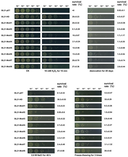 E. coli recombinant strains (BL21–pET, BL21–HD, BL21–Motif1, BL21–Motif2, BL21–Motif3, BL21–Motif4, BL21–Motif5, BL21–Motif6, BL21–Motif7, BL21–Motif8) were cultured in LB with appropriate antibiotics to OD600 ≈ 0.6 at 37 °C and were induced with IPTG at a final optimal concentration of 0.1 mM for 2 h. Subsequently, 1 mL of the cell suspension was pipetted into a new centrifuge tube, after which cells were treated with 10 mM H2O2 for 15 min, desiccated for 20 days, 0.8 M NaCl for 48 h and freeze-thawed 3 times for 20 min each time, as previously described [59]. Different serial dilutions of these cells were plated onto LB agar plates and incubated at 37 °C overnight before colonies were observed and calculated. The survival rate was expressed as the percentage of the number of colonies in the treated samples compared with those in untreated controls. All experiments were performed at least three times.