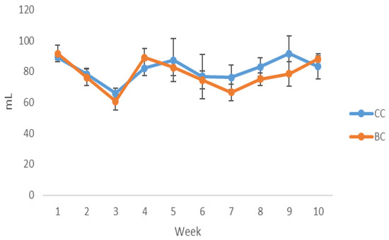 The daily intake of CC and BC juices per cage during 10 weeks of treatment is shown in Figure 1. The intake of juices did not significantly change during the 10 weeks of treatment and was approximately 80 mL (20% juice in tap water) per cage daily for both groups.