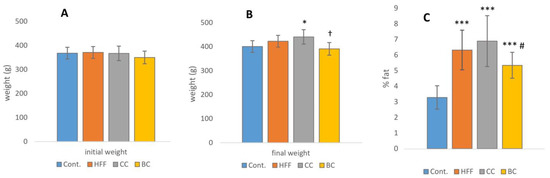(A) Initial and (B) final weight in rats on different treatments. (C) Visceral fat percentage in comparison to total body weight in rats on different treatments; Cont.—control group (rats on standard chow diet and tap water); HFF—rats on diet enriched with 25% fat, 20% fructose, and 0.1% of cholic acid and tap water; CC—rats on HFF diet and 20% cornelian cherry juice in tap water; BC—rats on HFF diet and 20% black currant juice in tap water. * p ≤ 0.05, *** p ≤ 0.001 vs. control, # p ≤ 0.05 vs. HFF; † p ≤ 0.05 vs. CC at the end of the study.