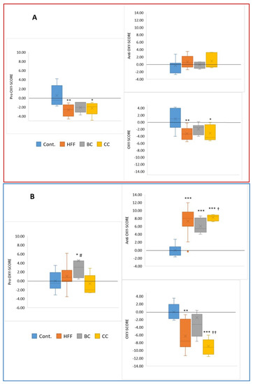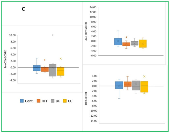 The oxy score represents the two primary components of oxidative stress: the build-up of oxidative damage and the decline in antioxidant defenses. Differences between pro-oxy, anti-oxy, and oxy scores in plasma, liver, and adipose tissue are presented in Figure 3.