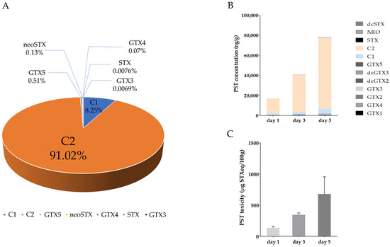 The proportion of PST analogs in A. catenella (A). The concentration (B) and toxicity (C) of PST in the digestive gland of P. yessoensis after exposure to A. catenella.