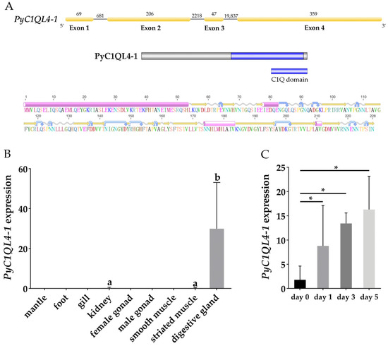 (A) The structure of PyC1QL4-1 gene and PyC1QL4-1 protein. Yellow rectangles represent exons, gray lines represent introns, and numbers represent the length of introns and exons. The pink cylinders, yellow arrows, blue arrows, and wavy lines stand for α-helices, β-strands, turns and coils, respectively; (B) The expression profiles of PyC1QL4-1 in adult P. yessoensis tissues. Values with different superscripts indicate statistical significance (p < 0.05); (C) The expression of PyC1QL4-1 in the digestive glands of P. yessoensis exposed to A. catenella (* indicates p < 0.05 and log2|FC| ≥ 2).