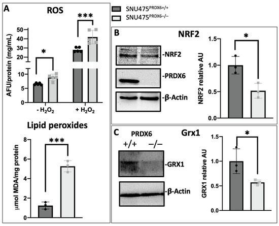 Oxidative stress induced by PRDX6 deficiency in SNU475 cells. (A) Top: ROS levels in basal and 100 μM H2O2-treated cells expressed as arbitrary fluorescence units (AFU) in the DCFDA assay normalized for protein concentration (n = 5); bottom: peroxidized lipid levels were determined by TBARS assay measuring the production of malondialdehyde (MDA) (n = 3). (B) NRF2 levels determined by Western blot; a representative blot is shown, and quantitative results are expressed as arbitrary units (AU) normalized to β-actin and relative to SNU475PRDX6+/+ levels (n = 3). (C) Normalized and relative to WT Grx1 levels determined using Western blot, expressed as arbitrary units (AU). (Black circles and grey squares are the individual values of the different replicas of WT and KO cells, respectively; Student’s t-test,* p-value ≤ 0.05; *** p-value ≤ 0.001).