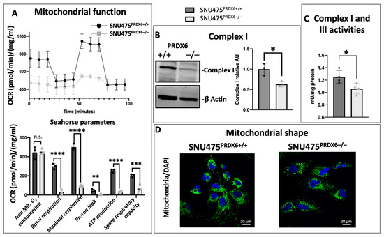 Mitochondrial respiratory functionality was determined using in vivo extracellular flow analysis by Seahorse. All parameters, including basal and maximal respiration, respiratory reserve capacity, as well as ATP production and proton leakage, decreased by more than 50% in SNU475 cells lacking PRDX6 (Figure 2A). These alterations in mitochondrial respiration are consistent with the decreased mitochondrial complex I observed with Western blot and enzymatic activity (Figure 2B,C) and the spheroid-shaped appearance of mitochondria instead of the normal reticulated morphology, as observed with fluorescence microscopy (Figure 2D).