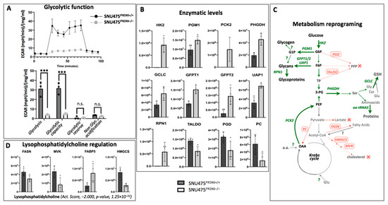 Metabolic reprogramming caused by PRDX6 deletion. (A) Representative recording of extracellular acidification rate (ECAR) during extracellular flow analysis following the protocol XF Glycolysis Stress Test for glycolytic function and histogram plots of the calculated glycolysis, glycolytic capacity, glycolytic reserve, and non-glycolytic acidification rates, normalized for protein content (n = 3). (B) Levels of 12 enzymes differentially expressed as quantified in the proteomic analysis are shown; intensity of the MS signal in area units for each protein, as calculated from areas of peptide peaks by the MaxQ algorithm, is shown in the Y axis (n = 4); data are presented in Supplementary Table S1B (Excel spreadsheet). (C) Scheme of interpreted metabolic flux changes according to enzymes up-regulated (names in green color, thick arrows) or down-regulated (names in red color, dotted arrows) in SNU475-KO cells compared to WT. (D) Levels of four enzymes of lipid metabolism known to be targets of lysophosphatidylcholine; the activation score calculated by IPA is shown underneath. (Multiple t-test, *** p-value ≤ 0.001, n.s. not significant).