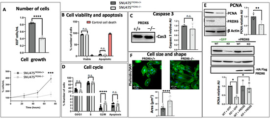 Growth, size, shape, and cell cycle of SNU475PRDX6−/− cells. (A) Top: cell count at time 0 and after 1 week of growth (n = 6); bottom: proliferation rate after 24, 48, and 72 h of cell culture (n = 4). (B) Determination of cell death and cell viability by FITC-marked annexin V and propidium iodide detection (n = 3). (C) Levels of caspase 3 relative to WT determined by Western blot (n = 3). (D) Flow cytometry analysis showing the number of cells in the different cell cycle phases in WT and SNU475 KO cells (n = 9). (E) Top: analysis of PCNA protein using Western blot normalized by β-actin and relative to WT (n = 5); bottom: PCNA levels in SNU475PRDX6−/− cells transfected with pcDNA3.1 + prdx6 or pcDNA3.1 + GFP, determined using Western blot (n = 3). (F) Cell shape and cell size determination expressed by cellular area in μm2 using immunofluorescence of the cytoskeleton with 488-marked phalloidin (n = 13). Cell size was also checked by measuring cell area (µm2) in transmission electron micrographs. AU = Arbitrary units. Multiple t-test, * p-value ≤ 0.05; ** p-value ≤ 0.005; *** p-value ≤ 0.001; **** p-value ≤ 0.0001; n.s. not significant.