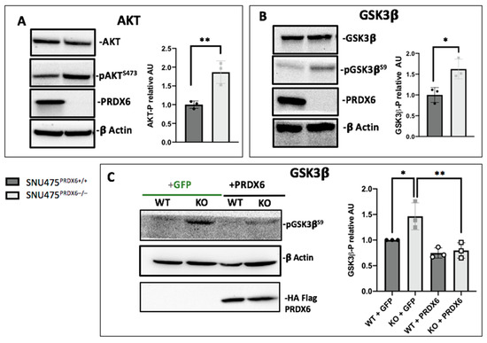 Cell signaling in SNU475PRDX6−/− cells. (A) Phosphorylation of AKT determined by Western blot normalized according to AKT total levels and relative to WT (n = 3). (B) Phosphorylation of GSK3β determined by Western blot normalized according to GSK3β levels and relative to WT (n = 3); (C) SNU475PRDX6−/− cells transfected with pcDNA3.1 + prdx6 or pcDNA3.1 + GFP normalized according to actin and relative to WT (n = 3). Multiple t-test, * p-value ≤ 0.05; ** p-value ≤ 0.005.