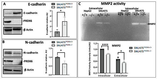 Epithelial–mesenchymal transition of PRDX6-deficient cell lines. (A) E-cadherin levels determined by Western blot in HepG2PRDX6+/+ and HepG2PRDX6−/− cells, relative to WT and normalized by β-actin levels (n = 3). (B) N-cadherin levels in SNU475PRDX6+/+ and SNU475PRDX6−/− cells by Western blot relative to WT and normalized to β-actin (n = 3). (C) Enzymatic activity of MMP2 (MW = 64kDa) on a gel containing 0.08% gelatin; each lane represents 20 μg of protein from medium (extracellular) and cell extract (intracellular) of HepG2 and SNU475 cells with or without PRDX6 (+/+ or −/−, respectively) (n = 3). (AU = Arbitrary units). (Multiple t-test, * p-value ≤ 0.05; **** p-value ≤ 0.0001).