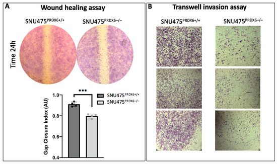Migration and invasiveness of SNU475PRDX6−/− and SNU475PRDX6+/+. (A) Representative wound closure assay with SNU475PRDX6+/+ and SNU475PRDX6−/− cells visualized at 24 h (upper) and quantitation (lower) measured by calculating the gap closure index (GCI) (n = 4). (B) Representative replicate Matrigel® transwell cell invasion assays using the same number of cells at time 0 and the endpoint at 24 h, showing fixed and stained translocated, invasive cells (upper transwell, non-invasive cells removed). Bright- field images under 10× magnification were taken for SNU475PRDX6+/+ and SNU475PRDX6−/− cells. Multiple t-test, *** p-value ≤ 0.001.