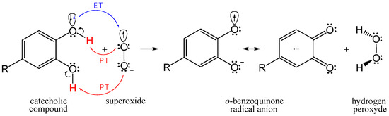 Natural polyphenolic antioxidants may exhibit a strong activity in scavenging of O2•−. Compounds with pyrogallol or catechol structural motifs were found to be the most rapid superoxide scavengers [73]. Some flavonoid’s colonic catabolites, which can be in situ produced by gut microbiota in high concentrations, possess catechol moiety, e.g., compound 2 [18]. In scavenging of O2•− by the catechol moiety, the concerted 2PCET mechanism involving two-proton and one-electron transfers resulting in ortho-benzoquinone radical anion and H2O2 has been proposed by Nakayama and Uno [74,75,76,77]. The single electron transfer (ET) reaction from the catechol moiety to O2•− occurs concertedly with the two-proton transfer (PT), as shown in Figure 2.