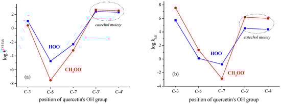 In a polar aqueous environment, the main contribution to HOO• and CH3OO• scavenging by Q exerts the 3-O− phenoxide anion followed by the catecholic moiety. Phenoxide monoanions of Q show higher potency in scavenging of CH3OO• radicals in comparison with HOO• radicals (Figure 3b). In the forthcoming sections, the obtained result for Q will be compared with the scavenging potency of flavonoid catecholic metabolites 1–5.