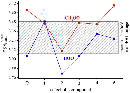 The experimentally measured rate constants corresponding to the reaction of HOO• with polyunsaturated fatty acids (PUFAs) are in the range of 1.18–3.05 × 103 M−1 s−1 [36]. Compounds that react faster with HOO• than the double allylic hydrogens of the PUFAs are expected to act as efficient antioxidants [61]. The reactivity of biological targets such as proteins and DNA is lower than that of bisallylic hydrogens in PUFAs [62]. The shadowed rectangle in Figure 4 represents the abovementioned protective threshold of 1.18–3.05 × 103 M−1 s−1, i.e., its log value of 3.08–3.48. Hence, the catecholic derivative 1, with a log value larger than the activity threshold, has the potential to protect biologically important molecules against HOO•-induced oxidative damage. The protective potency of catecholic derivatives 4 and 5 is reduced, while Q, 2, and 3 appear as inactive. A higher efficiency of 4 than the parent Q molecule in scavenging of the DPPH• radical was shown by an in vitro antiradical assay [29].