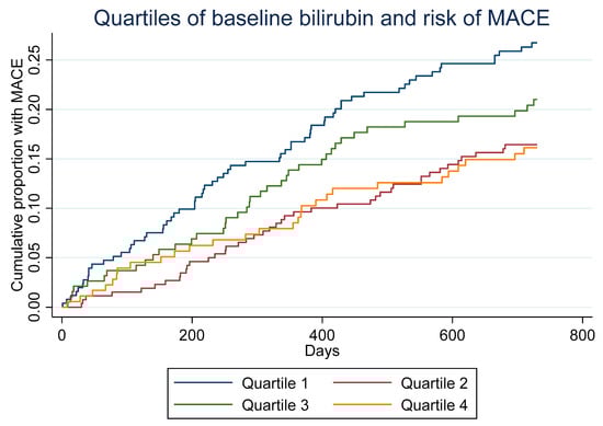 Cumulative proportion of major adverse cardiovascular events by quartiles of total bilirubin at baseline.