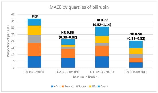 MACE occurred in 177 (20.1%) patients during mean ± SD 634 ± 205 days of follow-up. Higher concentrations of total bilirubin were associated with a lower risk of MACE in unadjusted analysis [HR 0.68 (95%CI 0.47–0.97) per log-unit increase, p = 0.032], and was close to statistical significance after adjusting for age, sex, BMI, smoking, NYHA class, and treatment allocation (Model 1) [HR 0.71 (95%CI 0.50–1.01) per log-unit increase, p = 0.06]. Patients in the lowest quartile of bilirubin (≤9 µmol/L) had the highest risk with HR 1.61 (95%CI 1.19–2.18), p = 0.002, compared to quartiles 2–4 (Figure 1). This association remained significant even after adjusting for age, sex, BMI, smoking status, NYHA class and treatment allocation (Model 1): HR 1.52 (1.21–2.09), p = 0.009. The individual components of the primary MACE endpoint trended in the same direction, but only reached statistical significance for coronary revascularization (Table 2; Figure 2). The association between bilirubin and MACE was consistent in women (HR 0.39 [95%CI 0.18–0.85, p = 0.018]) and in men (HR 0.75 [95%CI 0.50–1.12], p = 0.16), with a p = 0.13 for interaction by sex.
