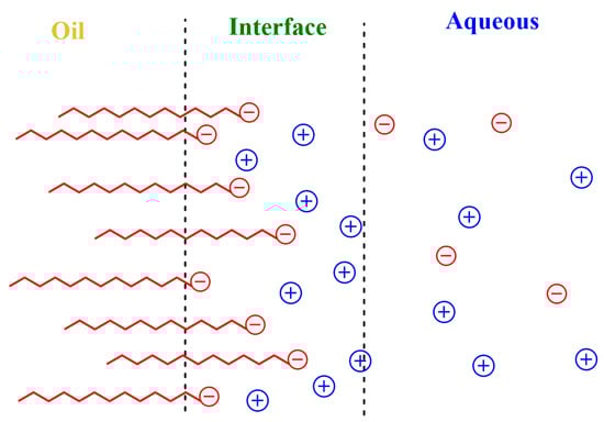 Emulsions are thermodynamically unstable systems that need some energy input to be created [9,10]. They can be stabilized kinetically by adding surfactants, which adsorb at the oil–water interface, creating an interfacial region with a thickness of several nanometers. An excess of the surfactant may spontaneously self-associate in the aqueous region, creating dynamic aggregates (micelles, reverse micelles, microemulsions) of various forms, depending on the surfactant structure and solution composition. All of them, including emulsions, have a common feature: they contain an interfacial region separating a polar bulk aqueous phase from an apolar, hydrocarbon-like region. When the surfactants employed are cationic or anionic, a fraction of the counterions remain in the interfacial region, and the thermal motion creates a diffuse electrical double layer, called the Gouy–Chapman layer, which extends to the aqueous phase and contains the remaining counterions, as shown in Figure 1.