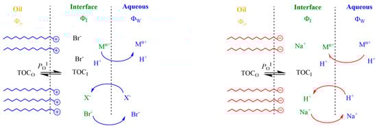 At cationic interfaces, the exchange is described by an empirical Donnan equilibrium constant between H+ and Br− [41,42]. Within cationic interfaces, the interfacial H+ concentration may be significantly lower, by one to two orders of magnitude, than the bulk [H+]. Cationic interfaces may repel metallic ions, Mn+, thus decreasing their effective interfacial concentrations, but may attract anions, as described in Equation (3). Cationic and zwitterionic emulsion interfaces selectively bind anions, typically following the Hofmeister series, as demonstrated by Gao et al. [13].