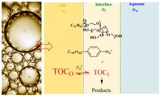 The distribution of AOs and their interfacial concentrations need to be determined in the intact emulsions to avoid the disruption of the existing equilibria. For this purpose, a special kinetic protocol was employed (Figure 3). The method exploits the chemical reaction between a hydrophobic arenediazonium ion, 4-hexadecylbenzenediazonium, 16-ArN2+, and the antioxidant to determine the partition constants in the aqueous–interfacial, PWI, and oil–interfacial, POI, regions of the emulsions [13,30,39,45,49,50,51]. The chemical probe 16-ArN2+ is located exclusively in the interfacial region of the emulsions, as shown in Figure 3, where it reacts with the antioxidant. The partition constant of a hydrophobic antioxidant such as δ-TOC, which is water-insoluble, in the oil–interfacial region, POI, is defined by Equation (5) [52,53,54], and the mathematical relationship between the observed rate constant kobs and the partition constant of hydrophobic antioxidants given by Equation (6) can be established. Details on the derivatization of Equation (6) can be found elsewhere [21,44]. In Equations (5) and (6), stoichiometric concentrations (moles per liter of total emulsion volume) are indicated by brackets, [ ], and the effective or real concentration in a particular region (expressed in moles per liter of the volume of the particular region) are indicated with parentheses, ( ). The subscript T stands for the stoichiometric or total concentration, and the subscripts O, I and W indicate the oil, interfacial and aqueous regions, respectively; ΦI = Vsurf/Vemulsion is the surfactant volume fraction (which is equal to that of the interfacial region), and ΦO is the oil volume fraction (ΦO = Voil/VTotal).