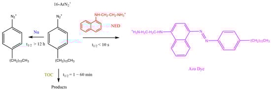 Emulsions are opaque, and thus, kobs values were obtained by employing a well-established derivatization method that exploits the rapid reaction between the coupling agent N-(1-naphthyl)ethylenediamine, NED, and the chemical probe, 4-hexadecylbenzenediazonium, 16-ArN2+, as shown in Figure 4. Details of the method, as well as its advantages and limitations, can be found elsewhere [44,45,58].