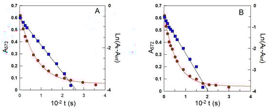 Representative variations in the pseudo-first-order decrease in the absorbance of the azo dye (λ = 572 nm) with time (Figure 4) obtained in intact 1:9 soybean oil/TW20/acidic water (A) and oil/CTAB/acidic water (B) emulsions. kobs values for the reaction between 16-ArN2+ and the antioxidant were indirectly determined from both the exponential and linear variations in the absorbance with time. The solid lines are the theoretical curves obtained by fitting the (A, t) and (ln(At −Ainf), t) pairs of data to the integrated and linearized pseudo-first-order equations. Runs were carried out in the intact emulsions in triplicate, and the average values (deviations less than 7%) were used in calculations. Other experimental conditions: pH = 4.5; ΦI = 0.005; [16-ArN2+] = 3.0 × 10−4 M; [δ-TOC] = 4.0 × 10−3 M; T = 25 °C.