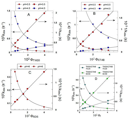 Figure 6A–D also show the effects of the electrical nature of the surfactant on kobs. At a given surfactant volume fraction ΦI, kobs values increase 6–9-fold upon increasing the pH of the aqueous phase as a consequence of the increase in the ionized form of the antioxidant, which is the reactive species, as indicated in Section 2.4.