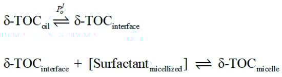 It may be worth noting here that the results reflected in Table 1 are in line with those recently reported by Fernández-Ventoso et al. [57], who investigated the effects of acidity on the distribution of tocopherols in olive and soybean oil emulsions, finding that a change in acidity does not change the distribution of tocopherols but modifies the intrinsic rate constants kI. However, these results apparently contradict those recently reported by Ichingolo et al. [66], who investigated the role of SDS on the apparent distribution of TOC in soybean emulsions, reporting that an increase in the surfactant concentration increases the amount of SDS micelles in the aqueous phase and that the amount of TOC in the “aqueous” phase increases. They claimed that the solubility of TOC in water is not affected by the presence of SDS molecules, but after reaching a certain concentration, called the critical micelle concentration, SDS molecules self-associate and form micelles, which can solubilize TOC molecules. Thus, an increase in the concentration of micelles would imply that the amount of TOC associated with the micelles increases according to the equilibria shown in Figure 7.