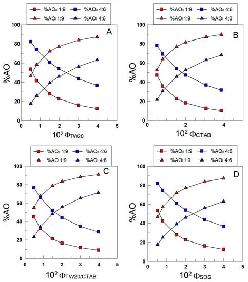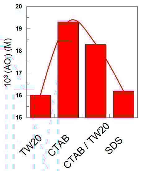 We think that the reasons for the discrepancy lie in the fact that the determinations of the amount of TOC in the aqueous phase made by Ichingolo et al. [66] were performed after breaking down the emulsions, and therefore, their results may be biased because of the disruption of the existing equilibria. The results in Table 1, in contrast, were obtained in intact emulsions. The variations in kobs-ΦI shown suggest that the partition constants of TOC are not altered by the presence of increasing amounts of surfactants. Otherwise, if the partition constants POI depend strongly on the concentration of the surfactant employed [surfactant] (which would change the concentration of micelles in the aqueous phase), we should obtain random variations in the kobs-ΦI profiles, which would imply large deviations from linearity in the kobs vs. ΦI plots, which is not the case. We note that, according to McClements [4,67] and others [21,44], micelles and emulsions are dynamic structures, breaking down and reforming at diffusion-controlled rates. Thus, no distinction between interfaces can be made, and the location of the antioxidant should be considered as an average position. The effect of increasing [surfactant] is an increase in the interfacial volumes of all physical structures present in the system and hence a decrease in the effective concentration of the antioxidant in the interfacial region.