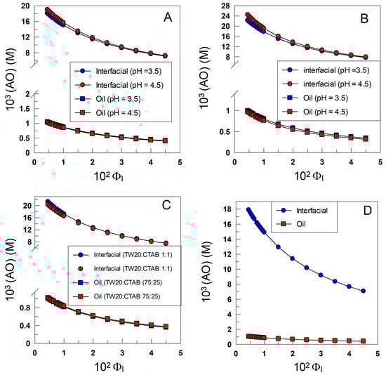 The distribution of δ-TOC was determined by employing Equations (8) and (9). Figure 8A–D show the variations in %δ-TOC with ΦI in the different emulsions. In all cases, more than 45% of δ-TOC is located in the interfacial region of 1:9 (o/w, v/v) emulsions, and the percentage increases upon increasing ΦI. At any given ΦI value, the results in Figure 8A–D show that the percentage of δ-TOC in the oil or interfacial region is essentially the same independently of the electrical charge of the surfactant; for example, when ΦI = 0.005 (the lowest surfactant concentration employed), %TOCI ≈ 45 in all emulsions (differences less than 10%), and when ΦI = 0.04, %δ-TOCI ≈ 90.