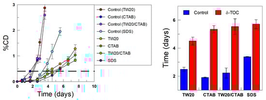 (Left) Kinetics of production of conjugated dienes with time in 4:6 (o/w, v/v) soybean emulsions at T = 60 °C in the absence (control) and presence of δ-TOC prepared with different surfactants (TW20, CTAB, CTAB/TW20 1:1 and SDS), ΦI =0.008 and [δ-TOCT] = 5 × 10−4 M. (Right) The relative oxidative stability assessed by determining the time required to increase the percentage of CDs in ΔCD = 0.5% (dashed line in kinetic profiles).