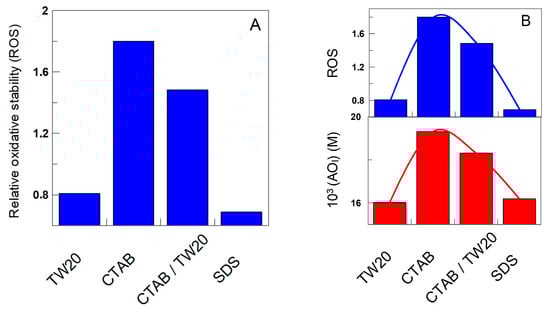 The exact role of surfactants in the kinetics of lipid oxidation is not, however, conclusive, and to make the relative oxidative stability independent of the matrix effect, we determined the relative oxidative stability, ROS, in the presence of δ-TOC by employing Equation (12), where tδ-TOC and tcontrol are the times necessary to obtain an increase in the production of CDs of 0.5%, and the results are displayed in Figure 12.