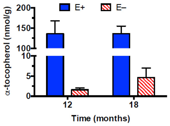 Muscle α-tocopherol concentrations. Zebrafish from the same cohort were fed a vitamin E-sufficient (E+, blue bars, n = 5 per group) or -deficient (E−, red striped bars, n = 5 at 12 months and n = 4 at 18 months) diet from age 45 days until 12 or 18 months. At the indicated times, fish were sacrificed, the muscles harvested, frozen, and kept frozen until analysis. α-Tocopherol skeletal muscle concentrations (mean ± SD) show a diet main effect (p ≤ 0.0001, no significant interaction or main effect of time).