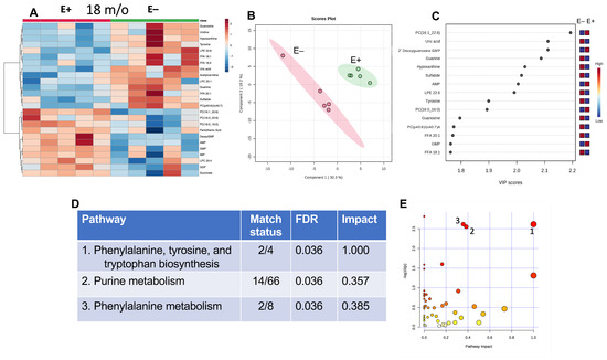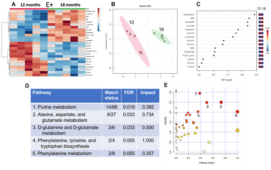 Analysis of E+ fish muscles at 12 vs. 18 months. The heatmap (A) shows the top 25 metabolites separating groups and their relative abundances per sample (red represents a higher concentration per sample while blue indicates a lower one). The partial least squares-discriminant analysis (PLS-DA) scores plot (B) separates 12- and 18-month E+ muscle samples by feature differences and displays a 95% confidence region around samples. Important features plot displays variable importance in projection (VIP) (C) of the PLS-DA and provides an estimation of the discriminatory power of each metabolite with a score. Larger VIP scores indicate greater discriminatory power in the PLS-DA models. The table (D) lists the top values shown in the graph of pathway analysis, while figure (E) displays pathway analysis by ranking metabolites by p-value (shown as −log10(p)) and pathway impact referenced against the KEGG (Kiyoto Encyclopedia of Genes and Genomes) Pathway Database. Red indicates highest impacts, clear the lowest, yellow and orange are intermediate.