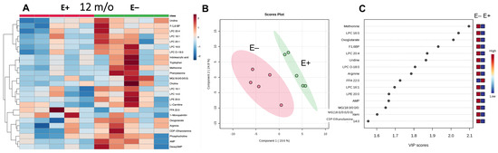 Metabolomic differences between E+ and E− fish muscles at 12 months. Shown are the heatmap (A) and PLS-DA scores plot (B), which separates E+ and E− muscle samples by feature differences and displays a 95% confidence region around samples and VIPs (C). There were insufficient statistically significant differences in the data from muscles of E+ and E− fish at 12 months for statistically meaningful pathway analysis.