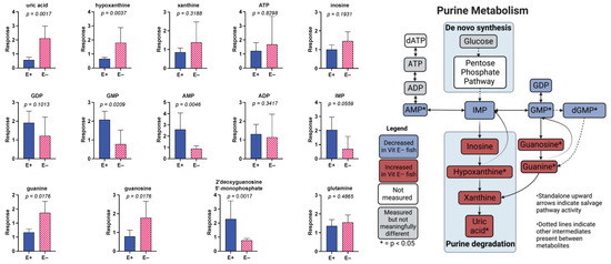MetaboAnalyst pathway analysis was used to generate the accompanying table by ranking significance and impact against known KEGG zebrafish biochemical pathways (Figure 4D) and as illustrated in the graph (Figure 4E). Impactful pathway changes included purine metabolism. Significantly different purines (shown in the bar charts, Figure 5) between E+ and E− muscles suggest that purine synthesis in the muscles of E– fish are downregulated while purine degradation is upregulated.