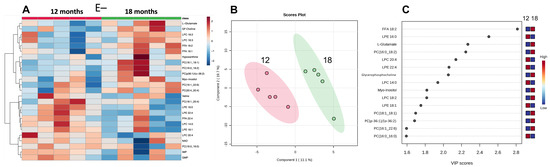 Metabolomic differences between E− fish at 12 and 18 months. Shown are the heatmap (A) PLS-DA scores plot (B,C) VIP scores. There was insufficient statistically significant differences in the data from muscles of E− fish at 12 and 18 months for statistically meaningful pathway analysis.