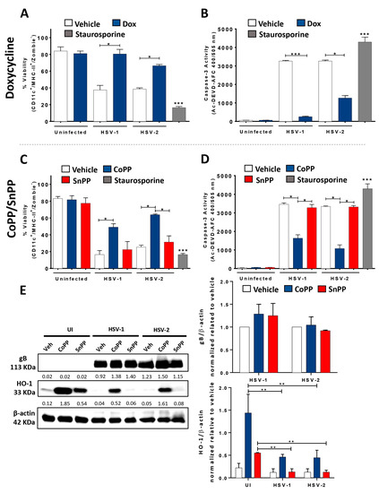 Similarly, inducing HO-1 expression with CoPP in HSV-infected DC cultures elicited 50–65% viable cells, compared to the less than 30% viable DCs when treated with the HO-1 antagonist SnPP and infected with HSV (Figure 1C). Activated caspase-3 levels were also significantly reduced in CoPP-treated and HSV-infected DCs as compared to SnPP- or vehicle-treated and HSV-infected DCs (Figure 1D). These results suggest that the stimulation of HO-1 expression in DCs positively modulates the viability of HSV-infected DCs, supporting a cytoprotective role for this host factor upon HSV infection.