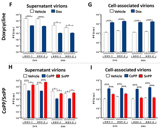 Previously, we reported that the pharmacological induction of the host enzyme heme oxygenase-1 (HO-1) in epithelial cells and neurons blocks the replication of HSV-2 [22]. HO-1 is induced in mammal cells in response to stress, such as hypoxia, or pathological conditions that release porphyrins (cofactors) that, if not correctly processed by the cell, leads to oxidative stress [23,24]. HO-1 catalyzes the conversion of iron-containing porphyrin groups, such as heme, into three products: ferrous iron (Fe2+), carbon monoxide (CO), and biliverdin [25], the latter being rapidly converted into bilirubin by biliverdin reductase [26]. Importantly, all these products have cytoprotective effects for the cell, such as reducing apoptosis [25,27].