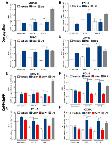 HSV-infected DCs induced to express HO-1 upregulate PDL-1, PDL-2 expression, and IL-10 secretion. (A) Surface expression of MHC-II (I-Ab) in DCs measured by FACS (in CD11c+, MHC-II+ (I-Ab), Zombie-) at 24 hpi with HSV-1 or HSV-2, previously treated for 16 h with doxycycline (Dox, 1.5 μg/mL). Surface expression of (B) PDL-1, (C) PDL-2 and (D) OX40L in HSV-1- or HSV-2-infected and Dox-treated DCs. (E) Surface expression of MHC-II in DCs measured by FACS at 24 hpi in HSV-1- or HSV-2-infected DCs previously treated with CoPP or SnPP (50 µM) for 6 h. Surface expression of (F) PDL-1, (G) PDL-2 and (H) OX40L in HSV-1- or HSV-2-infected and CoPP-treated DCs. Detection of (I) TGF-β, (J) IL-23, (K) IL-10 and (L) IL-1β secretion in the supernatants of HSV-1- and HSV-2-infected and Dox-treated DCs. Detection of (M) TGF-β, (N) IL-23, (O) IL-10 and (P) IL-1β secretion in the supernatants of HSV-1- and HSV-2-infected and Dox-treated DCs. LPS: lipopolysaccharide. Statistical analysis: Kruskal–Wallis and Dunnett’s multiple comparison (* p < 0.05).