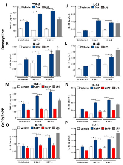 Additionally, we assessed the secretion of IL-6, IL-12 (Supplementary Figure S1), TGF-β, IL-23, IL-10, and IL-1β (Figure 2I–P) in the supernatants of HSV-infected DCs previously treated or untreated with the inducers of HO-1 expression. Overall, TGF-β, IL-23, IL-10, and IL-1β expression were significantly increased in HSV-infected DCs previously treated with Dox or CoPP compared to SnPP- or vehicle-treated HSV-infected DCs (Figure 2I–P).