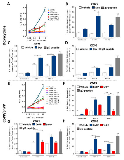 Dox treatment in HSV-infected DCs elicited significant IL-2 secretion by virus-specific CD4+ T cells in the supernatants, an indication of T cell activation (Figure 3A). Additionally, we observed a significant increase in CD25 expression (the light chain of the IL-2 receptor) on the surface of these virus-specific CD4+ T cells by flow cytometry, which also accounts for T cell activation (Figure 3B). Furthermore, HO-1 induction in HSV-infected DCs led to a significant increase in the surface expression of CD71 in CD4+ T cells, an early activation marker in these cells that was not observed in co-cultures with SnPP- or vehicle-treated HSV-infected DCs (Figure 3C). DCs treated with CoPP and infected with HSV also elicited a significant increase in IL-2 secretion by T cells (Figure 3E), as well as CD25 (Figure 3F) and CD71 (Figure 3G) surface expression in these cells compared to the control conditions.