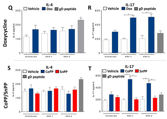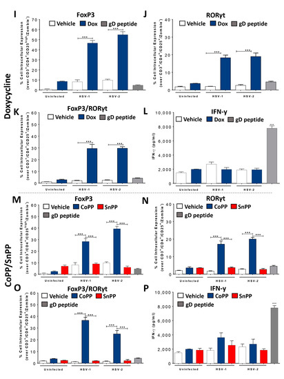 HSV-infected DCs induced to express HO-1 promote the polarization of virus-specific CD4+ T cells toward Treg, Th17 and mixed Treg/Th17 phenotypes in vitro. (A) IL-2 secretion in supernatants of co-cultures with transgenic virus-specific gDT-II CD4+ T cells and HSV-1- or HSV-2-infected and treated DCs, measured by ELISA at 48 hpi. DCs were previously treated for 16 h with doxycycline (Dox, 1.5 μg/mL) or vehicle. (B) Surface expression of CD25 in CD4+ T cells co-cultured with HSV-infected Dox-treated DCs, measured by FACS (in CD3+, CD4+, Zombie- cells) 48 hpi. (C) Surface expression of CD71 in CD4+ T cells. (D) Surface expression of OX40 in CD4+ T cells. (E) IL-2 secretion in the supernatants of co-cultures with CD4+ T cells and HSV-infected DCs previously treated for 6 h with CoPP or SnPP (50 µM). (F) Surface expression of CD25 in CD4+ T cells (CoPP/SnPP). (G) Surface expression of CD71 in CD4+ T cells (CoPP/SnPP). (H) Surface expression of OX40 in CD4+ T cells (CoPP/SnPP). (I) Intracellular expression (CD3+, CD4+, CD25high, Zombie- cells) of the transcription factor FoxP3 in CD4+ T cells co-cultured with Dox-treated DCs. (J) Intracellular expression of RORγt in CD4+ T cells co-cultured with Dox-treated DCs. (K) Intracellular expression of transcription factor FoxP3 and RORγt in CD4+ T cells co-cultured with Dox-treated DCs. (L) IFN-γ secretion in supernatants of co-cultures with CD4+ T cells and Dox-treated DCs. (M) Intracellular expression of transcription factor FoxP3 in CD4+ T cells (CD3+, CD4+, CD25high, Zombie- cells) co-cultured with CoPP- or SnPP-treated DCs. (N) Intracellular expression of RORγt in CD4+ T cells co-cultured with CoPP- or SnPP-treated DCs. (O) Intracellular expression of transcription factor FoxP3 and RORγt in CD4+ T cells co-cultured with CoPP- or SnPP-treated DCs. (P) IFN-γ secretion in supernatants of co-cultures with CD4+ T cells and CoPP- or SnPP-treated DCs. (Q) IL-4 secretion in supernatants of co-cultures with CD4+ T cells and Dox-treated DCs. (R) IL-17 secretion in supernatants of co-cultures with CD4+ T cells and Dox-treated DCs. (S) IL-4 secretion in supernatants of co-cultures with CD4+ T cells and CoPP- or SnPP-treated DCs. (T) IL-17 secretion in supernatants of co-cultures with CoPP- or SnPP-treated DCs. CD4+ T were stimulated with gD peptide as a positive control. Statistical analysis: Kruskal–Wallis and Dunnett’s multiple comparison (* p < 0.05, *** p < 0.001).