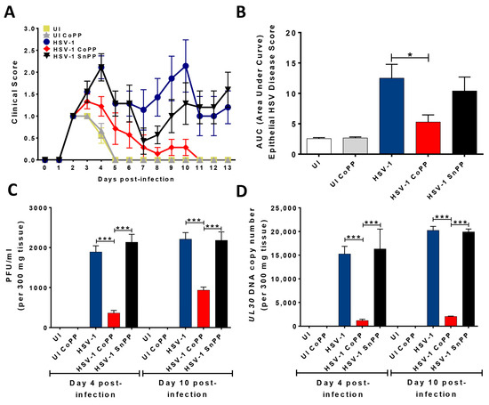 To extend our understanding on the effects of the stimulation of HO-1 expression in DCs upon HSV infection, we assessed the contribution of these cells in a clinically relevant HSV-1 skin infection model [38,39]. For this, we followed the disease progression in animals receiving CoPP-treated HSV-infected DCs before dermal infection with HSV-1. As shown in Figure 5, mice receiving CoPP-treated HSV-infected DCs displayed reduced HSV-associated symptoms, delayed disease onset, as well as both reduced the maximum clinical scores and decreased the mean clinical scores at days 4 and 10 after infection (Figure 5A and Supplementary Table S1). Furthermore, animals that received CoPP-treated HSV-infected DCs prior to HSV-1 infection displayed significantly less skin pathology scores associated with HSV compared to mice receiving vehicle-treated HSV-infected DCs that were later infected with HSV in the skin, as determined by measuring the area under the curve (AUC) in Figure 5A, which provides an integrated value of score severity with disease duration (Figure 5B). In addition, we observed that transferring HSV-infected DCs induced to express HO-1 after CoPP treatment into the animals, and not vehicle-treated HSV-infected DCs or SnPP-treated HSV-infected DCs, significantly reduced HSV-1 loads in the infected tissue (Figure 5C), as both lesser PFUs and viral genome copies were detected in the skin samples recovered (Figure 5D).